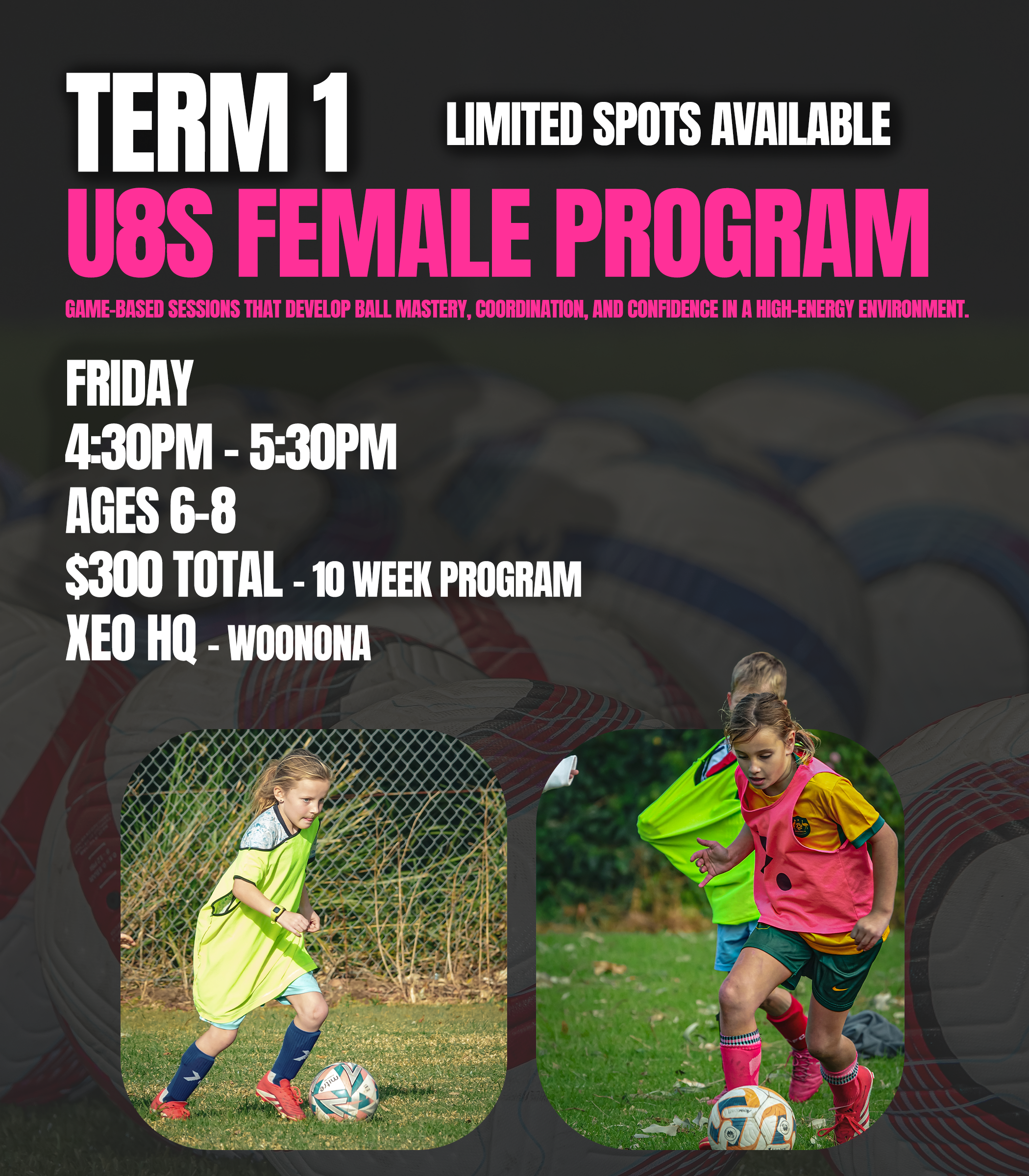A supportive and confidence-building football program designed specifically for young female players. Sessions focus on ball control, movement, and enjoyment in a positive environment that encourages participation and self belief.